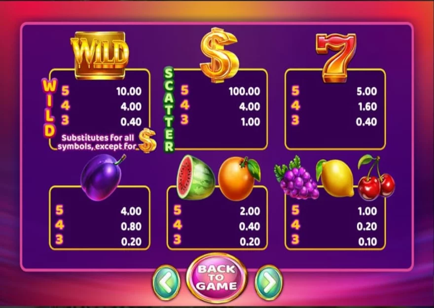 Pak se zde nacházejí ještě čtyři další symboly. Nejdříve si ale popíšeme, co můžete vyhrát v případě švestky, sedmičky a znaku dolaru. Výši násobení sázky v případě výhry uvádíme ve stejném pořadí: