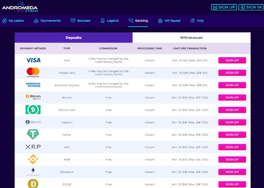 Andromeda Casino nabízí několik atraktivních platebních možností, které hráči mohou použít pro vklady. Nejprve se podíváme na ty nejběžnější. Do kasina Andromeda můžete vložit finanční prostředky prostřednictvím platebních karet Visa nebo MasterCard. K dispozici je rovněž běžný bankovní převod. Nezapomínejte ale na to, že bankovním převodem trvá transakce déle.