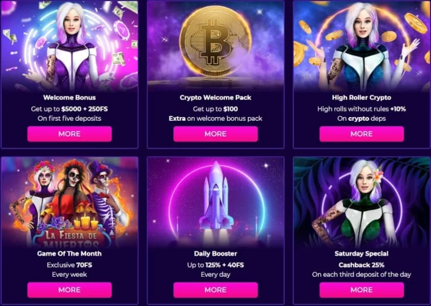 Andromeda Casino podporuje také kryptoměny. Není proto divu, že pro hráče, kteří nahrají finanční prostředky v kryptoměně získají také speciální bonus. Získat můžete vedle bonusových 100 dolarů také volné spiny. Možná vás zajímá kolik, a na jaké automaty: