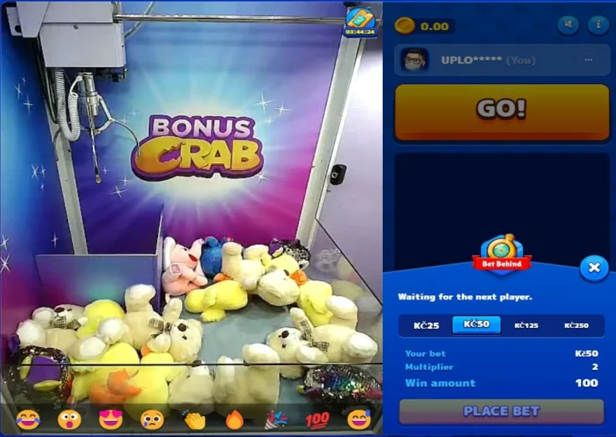 Bonus Crab nabízí zajímavou možnost získat výhry i pro hráče bez žetonů. Můžete se totiž jednoduše vsadit na to, zda následující hráč vytažení plyšového hračky zvládne! Máte možnost vsadit částky 25, 50, 125 nebo 250 Kč. Pokud se hráči skutečně podaří vytažení plyšáka, získáte dvojnásobek vaší sázky. Můžete tedy sledovat snahu ostatních hráčů a prožít trochu adrenalinu i v případě, kdy zrovna nemáte Crab žeton.