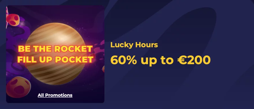 Lucky Hours jsou speciální, časově limitované akce v CosmicSlot casinu, během kterých můžete získat úžasný bonus ve výši 60 % až do €200. Tyto hodiny nabízejí hráčům jedinečnou příležitost obohatit své herní zážitky a vyhrát atraktivní odměny.