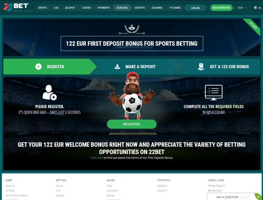 Nabídka welcome bonusu pro sport a eSports je 100% vkladový bonus, to znamená, že nejprve musíte na svůj herní účet vložit alespoň 1 €. Pokud si však chcete zajistit maximální bezplatný startovací kredit ve výši 122 €, doporučujeme vložit přesnou částku a nechat 22Bet ji zdvojnásobit. Startovací kredit je pak třeba 5x do týdne vsadit, aby mohl být vyplacen. Můžete vsadit na kombinace 3 s minimálním kurzem 1,40.