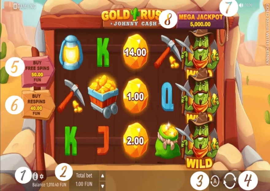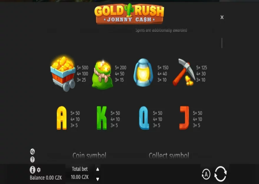 Gold Rush Johnny Cash je pětiválcový online výherní automat, který hráčům nabízí celkem 25 výherních linií. Vyhodnocování výher pak probíhá zleva doprava. Maximální výše sázky na jeden spin může být 1 000 Kč. K dispozici máte také možnost si zakoupit free spiny nebo respiny. V případě koupě free spinů zaplatíte 50násobek sázky, v případě respinu je to 40násobek vaší sázky.