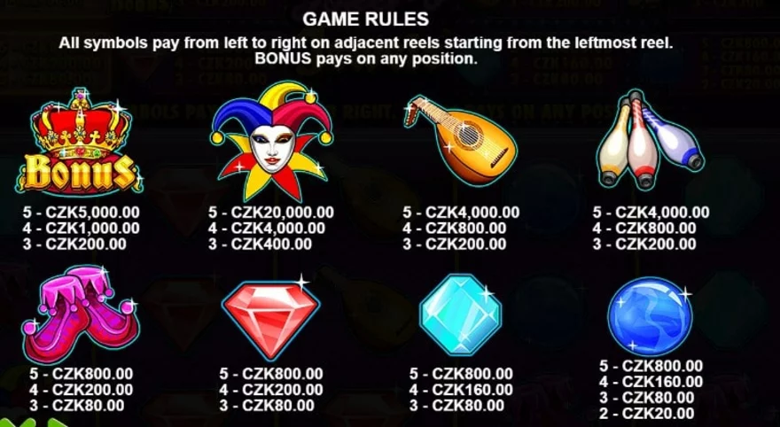 Pro hráče je připraveno celkem osm výherních symbolů, z nichž každý má připravené jiné možnosti vyplacení výher. Podíváme se ale, kolik peněz můžete získat za které symboly. Zdaleka nejvýnosnějším symbolem je šašek. Ten vám nabízí 1 000násobek původní sázky v případě, že na jedné linii získáte pět šašků.