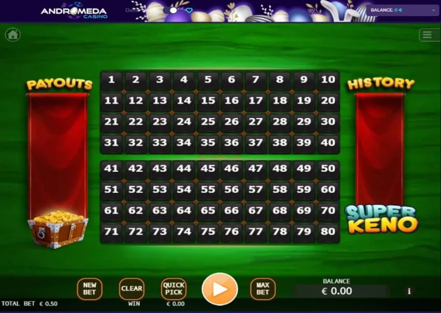 Andromeda Casino nabízí celou řadu hry Keno, která se zde objevuje v různých proměnách. Zahrát si tak můžete například Keno Universe, Super Keno a další. Základem Kena je, abyste vybrali čísla, která v následujícím slosování padnou. Pravidla jsou velmi jednoduchá a šance na výhru nemalá.