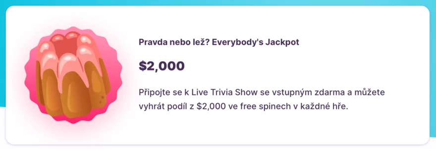 Výherci každé hry mohou získat podíl z $2,000 ve free spinech. Čím lépe odpovíte, tím větší podíl z jackpotu můžete získat. Nechte se odměnit za své znalosti!