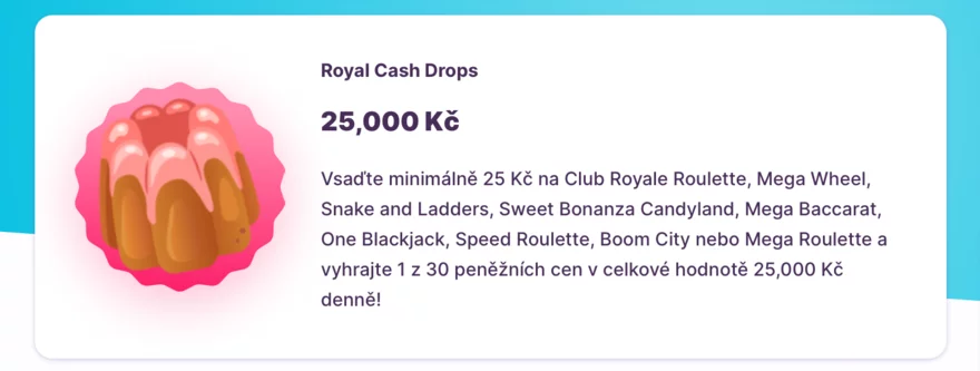 2. Royal Cash Drops: Následně vsaďte minimálně 25 Kč na kvalifikační hry, které zahrnují Club Royale Roulette, Mega Wheel, Snake and Ladders, Sweet Bonanza Candyland, Mega Baccarat, One Blackjack, Speed Roulette, Boom City, nebo Mega Roulette.