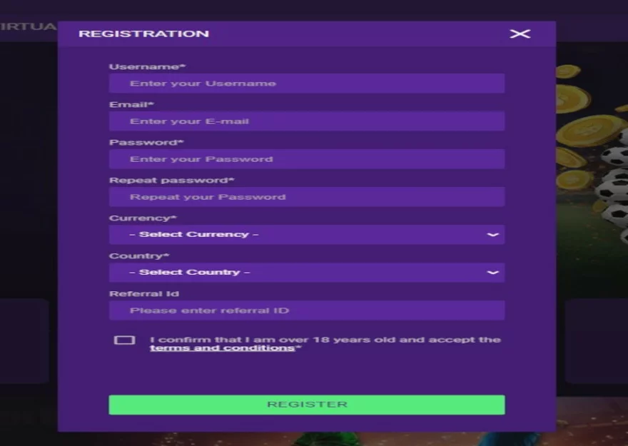 Abyste se mohli registrovat, stačí přijít na hlavní stránku BetPlays Casina a v pravém horním rohu kliknout na zelené tlačítko REGISTER. Tím si otevřete registrační formulář, který je potřeba vyplnit. Formulář je opravdu jednoduchý.