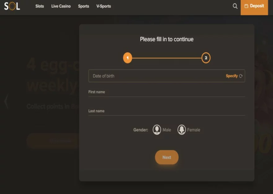 Sol Casino po vás bude chtít ještě další informace o vás. Jedná se například o datum vašeho narození, vaše jméno a příjmení. Vybrat pak musíte také své pohlaví.