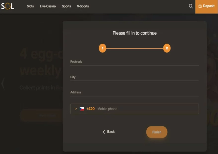 Ve dalším kroku je potřeba vyplnit údaje o vašem bydlišti a bude také potřeba zadat vaše telefonní číslo. Na to vám může čas od času přijít od Sol Casina upozornění na akce a novinky, které jsou pro hráče připraveny.