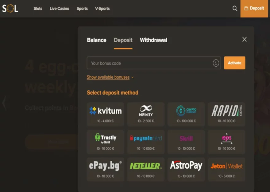 Jakmile zadáte také tyto údaje, máte registraci hotovou. V tuto chvíli si můžete vybrat jeden ze s vstupních bonusů a pomocí podporovaných platebních metod můžete provést první vklad do Sol Casina!