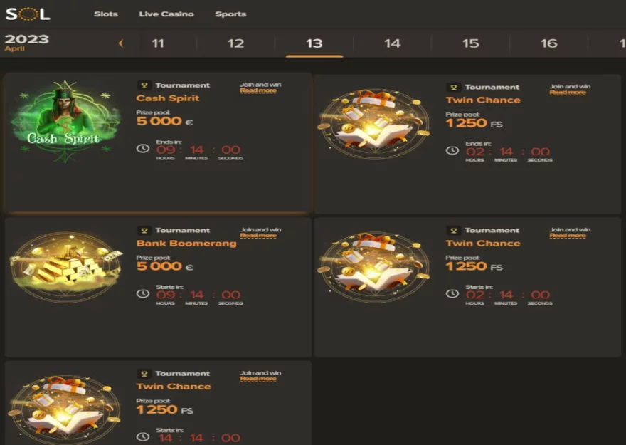 Turnaje v online casinech jsou skvělou zábavou, kterou si můžete zkrátit dlouhou chvíli. Sol Casino navíc nabízí opravdu velké množství turnajů na každý den. V rámci turnajů pak můžete získat část peněz z předem vyhrazeného prize poolu, případně lze hrát také o free spiny. Vždy se seznamte s pravidly turnaje před tím, než se do něj přihlásíte.