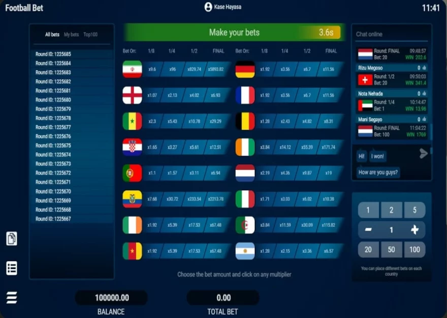 Velmi zajímavou hrou je Footbal Bet. Zde máte na začátku výběr ze 16 náhodných reprezentačních týmů. Máte celkem 14 vteřin na to, abyste si vybrali zemi, na kterou chcete vsadit a fázi turnaje, do které se daná reprezentace dostane. Na výběr máte osmifinále čtvrtfinále, semifinále nebo přímo finále. Turnaj se pak vyhodnotí během asi deseti vteřin. Poté můžete sázku zopakovat.