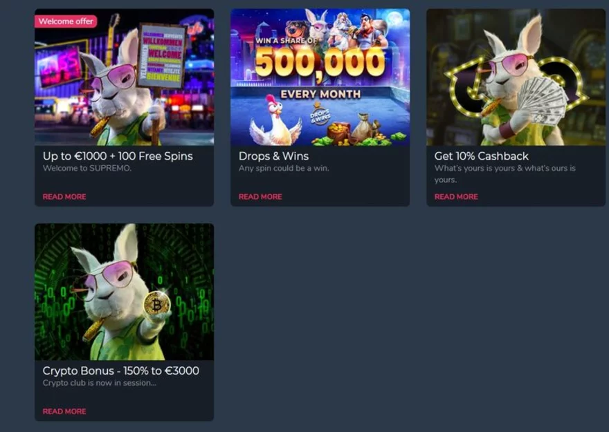 Věčná škoda, že bílý králík v Supremo Casino nedával pozor, když se mluvilo o tom, co mají hráči v online casinech nejraději. Ano mluvíme o casino bonusech. Těch si totiž pro vás Supremo Casino moc nepřipravilo. Krom uvítacího balíčku na vás čeká pouze cashback bonus. Co se hazardních her týče, tak nevynechalo žádnou kategorii, ale zapomněli na dostatečné spektrum výběru. Do Supremo Casino dodává své herní tituly pouze 21 herních studií, takže her tak nepřeberné množství nenajdete.