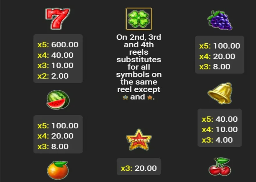 Jsou zde také symboly, které v případě výhry znásobí vaši sázku 100×. Jedná se o symbol hroznů a melounu. Máme zde také bonusový symbol čtyřlístku, který funguje jako WILD. Dokáže tak nahrazovat symboly, které by vám jinak chyběly do výherní kombinace.