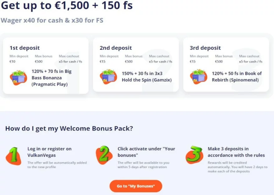 Vulkan Vegas si připravilo uvítací balíček pro nově registrované hráče. V rámci welcome bonusu se tak můžete těšit až na 1 500 € a 150 volných spinů. Ty můžete využít na nejoblíbenějších online výherních automatech.