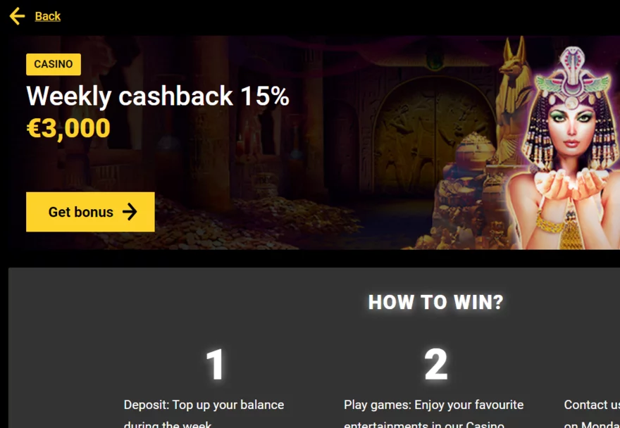 Tento cashback si mohou nárokovat pouze hráči, kteří již dosáhli VIP level 3 a výš. Můžete pro tento cachback použít pouze prohry z casino sekce, tudíž se nevztahuje na kursové sázení.