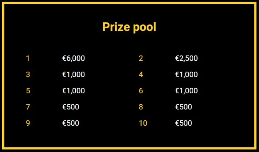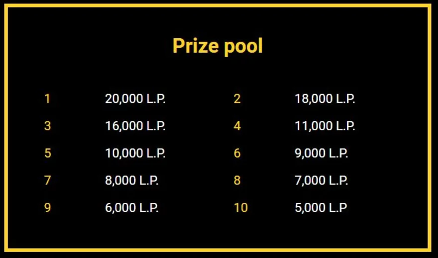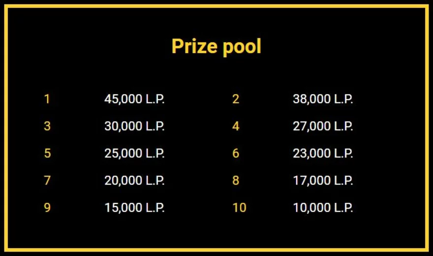 Nejvyšší možná výhra je 250 000 L.P. – výherce za 1. místo získá 45 000 L.P., za druhé 38 000 L.P. a tak to pokračuje dál jako na obrázku níže. Také musíte protočit alespoň 20 EUR/500 Kč, abyste mohli být právoplatnými členy turnaje a minimální sázka točky je 0,30 EUR. Dávejte pozor na počet hráčů, kteří aktuálně hrají, platí pravidlo, že se musí účastnit alespoň 50 lidí, aby byl turnaj platný, jinak nic nevyhrajete.