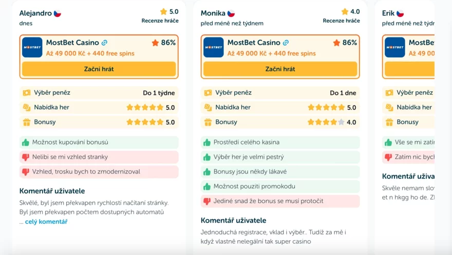 MostBet Casino patří mezi nejlépe hodnocená casina na českém trhu, především díky velkému počtu hráčských recenzí. Právě množství zkušeností dává tomuto hodnocení vysokou váhu a vypovídací hodnotu. Hráči oceňují, že casino funguje stabilně, bez výrazných výkyvů v kvalitě služeb.