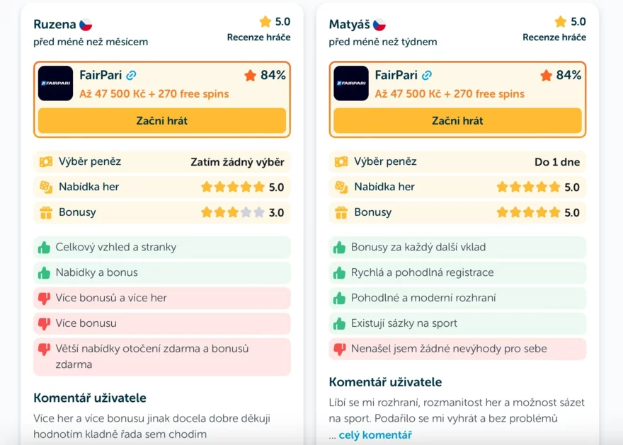 Hráči v recenzích zmiňují především přehledné prostředí a silný vstupní bonus, který je kombinací finanční částky a free spinů. FairPari působí jako casino s potenciálem, které si teprve buduje dlouhodobou reputaci mezi českými hráči.