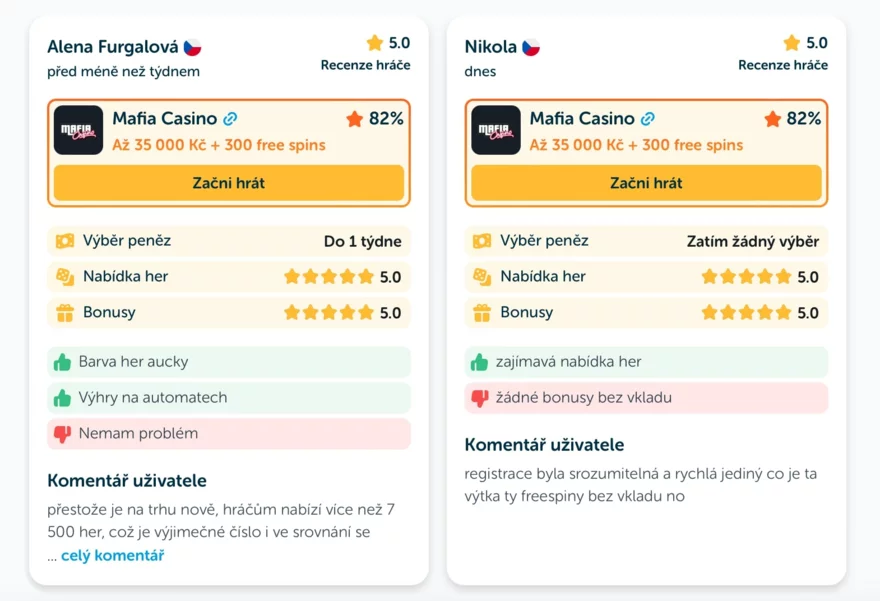 Mafia Casino si drží maximální hodnocení hráčů, přestože má zatím nižší počet recenzí. Hráči oceňují především jednoduchost, jasná pravidla a pocit férového zacházení už od začátku hraní.