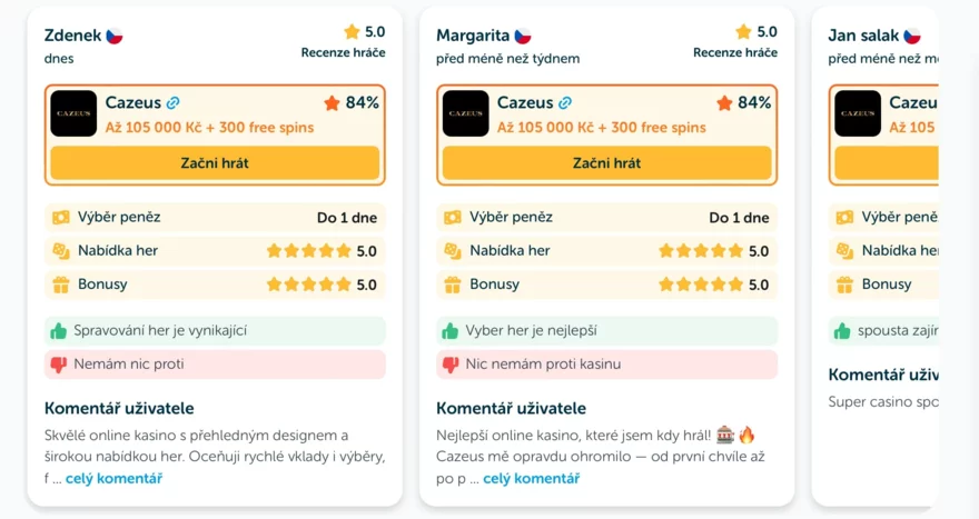 Cazeus Casino zaujme především velmi vysokým vstupním bonusem, který patří k největším v přehledu. Hráči v recenzích zmiňují, že casino působí profesionálně a technicky stabilně.