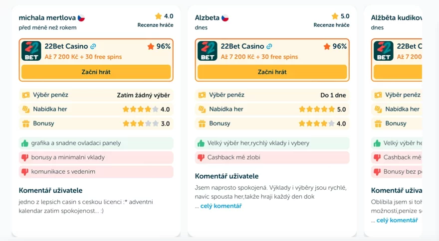 Hráči oceňují především širokou nabídku her a možnost kombinovat casino se sportovním sázením. 22Bet působí jako univerzální platforma, která vyhovuje hráčům hledajícím vše na jednom místě.