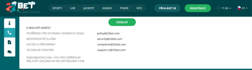 support-cz@22bet.com – hlavní kontaktní adresa pro českou podporu