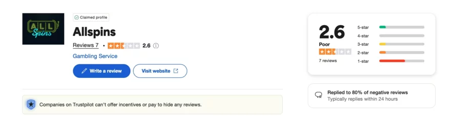 AllSpins Casino poskytuje základní nástroje pro zodpovědné hraní – možnost nastavit limity, dočasně se vyloučit nebo kontaktovat zákaznickou podporu kvůli problémovému hraní. Na webu jsou odkazy na organizace zabývající se prevencí závislosti. V recenzích na AskGamblers má casino skóre 9,2/10, což svědčí o vysoké spokojenosti hráčů. Na Trustpilot je hodnocení nižší (2,6/5), což je však u nových casin běžné – často kvůli nedorozuměním ohledně výběrů nebo bonusových podmínek.