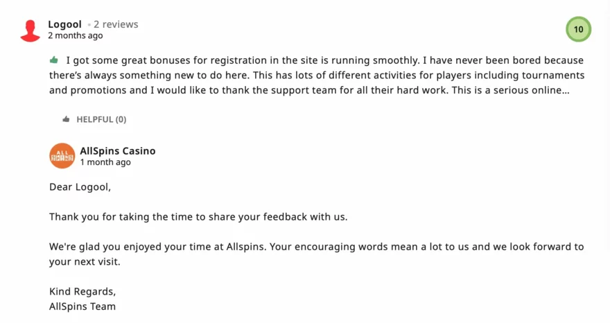 Casino je aktivní na online fórech a reaguje na stížnosti hráčů, zejména na stránkách jako AskGamblers. Stížnosti jsou většinou řešeny konstruktivně a s důrazem na dodržování pravidel. AllSpins Casino se prezentuje transparentně i na vlastním webu – jasně komunikuje podmínky bonusů, výběrů a ochrany osobních údajů.