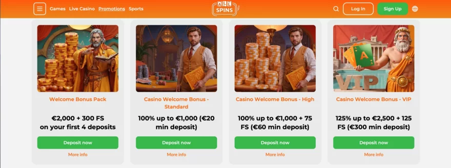 AllSpins Casino sází na velkorysý uvítací balíček rozdělený do čtyř částí. Hned při prvním vkladu můžete získat 100 % až do 1 000 € + 75 free spinů, při druhém vkladu 100 % až do 500 € + 75 free spinů, třetí a čtvrtý vklad přináší 100 % až do 250 € + 75 free spinů. Celkem tak můžete získat až 2 000 € a 300 free spinů. Minimální vklad pro aktivaci každého bonusu je od 20 € do 60 € (nebo ekvivalent v CZK). Uvítací balíček je rozdělený, což umožňuje postupné čerpání a lepší správu bankrollu.