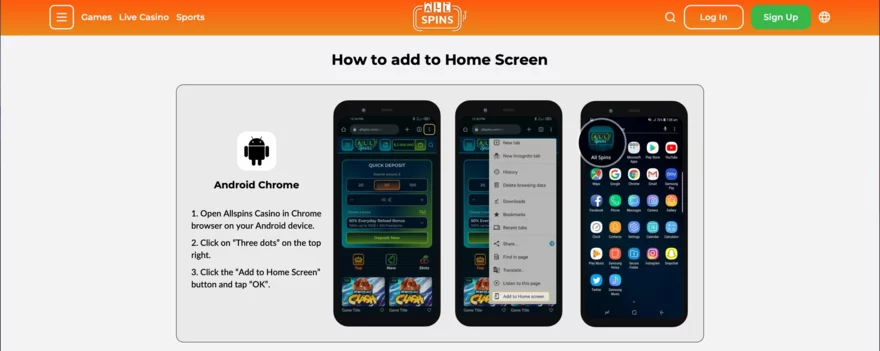 AllSpins Casino nemá samostatnou mobilní aplikaci, ale web je plně optimalizovaný pro všechna mobilní zařízení díky responzivnímu designu a HTML5 technologii. Hry a stránky se načítají rychle, grafika je ostrá a prvky jsou přizpůsobené dotykovému ovládání. Všechny funkce desktopové verze jsou dostupné i na mobilu – včetně vkladů, výběrů, účasti v promoakcích a správy účtu.