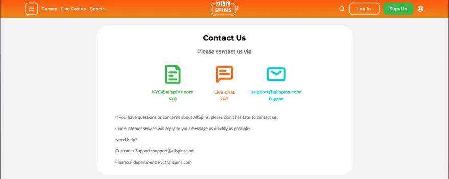 Zákaznická podpora AllSpins casina je dostupná 24/7 prostřednictvím live chatu a e-mailu (support@allspins.com). Live chat je přístupný přímo z webu a reakční doba je velmi rychlá – během testování jsme odpověď obdrželi do jedné minuty. V současnosti však není dostupná komunikace v češtině - všechna komunikace probíhá v angličtině, případně v dalších podporovaných jazycích (např. polština, němčina, finština).