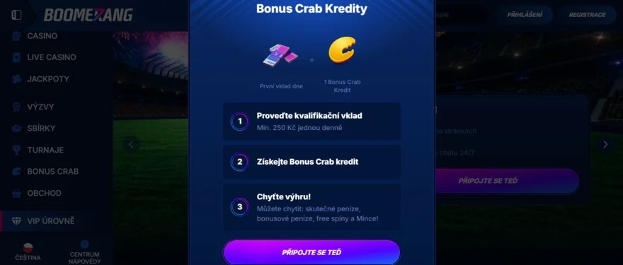 Lokalizace plateb: Při registraci si zvolíte měnu účtu – pro Čechy je k dispozici česká koruna (CZK), což doporučujeme, ať nemusíte pak řešit konverze. Podle zvolené měny a země se vám zobrazí dostupné metody. Boomerang se snaží nabízet relevantní metody pro každý trh, takže např. polským hráčům nabídne Blik, skandinávským Trustly apod. (pro ČR zmiňme, že třeba PayPal k dispozici není, ale to v casinech obecně nebývá). Důležité plus: kasino neúčtuje poplatky za vklady ani výběry.