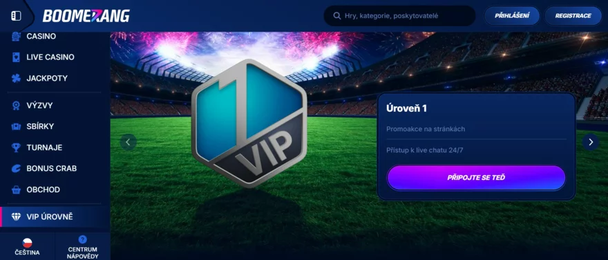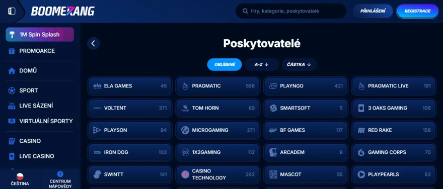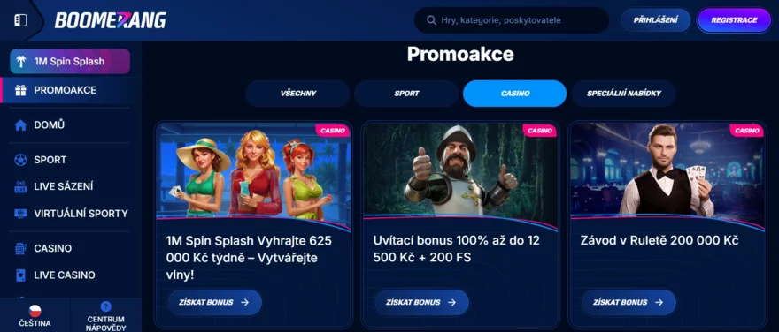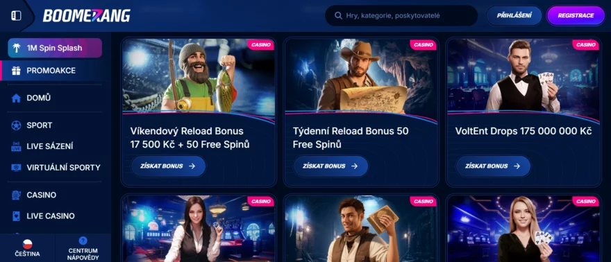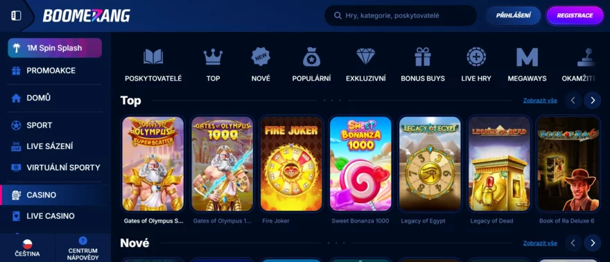 Design webu je možná trochu výrazný (černo-červená barevná kombinace a dynamické grafiky), ale vše je funkční a uživatelsky přehledné. Navigace je intuitivní. V hlavním menu si přepnete na Casino, Live Casino, Sázky (bookmaker), případně Promo akce, Turnaje nebo VIP program. Ano, Boomerang není jen casino – má také integrovanou sázkovou kancelář pro sportovní fanoušky, což rozšiřuje záběr platformy. Pro hráče to znamená možnost využít jeden účet na vše (casino hry i sportovní sázky) a také to svědčí o zaměření kasina na širší trh.