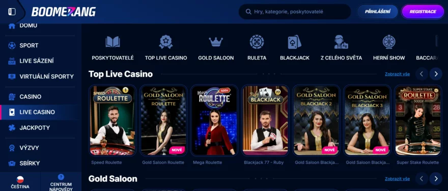 Live hry běží hladce a jsou přehledně rozděleny do podkategorií v lobby. Dokonce tu je speciální Live Cashback bonus pro hráče živých her, což ukazuje, že i na live sekci Boomerang myslí s promo akcemi.