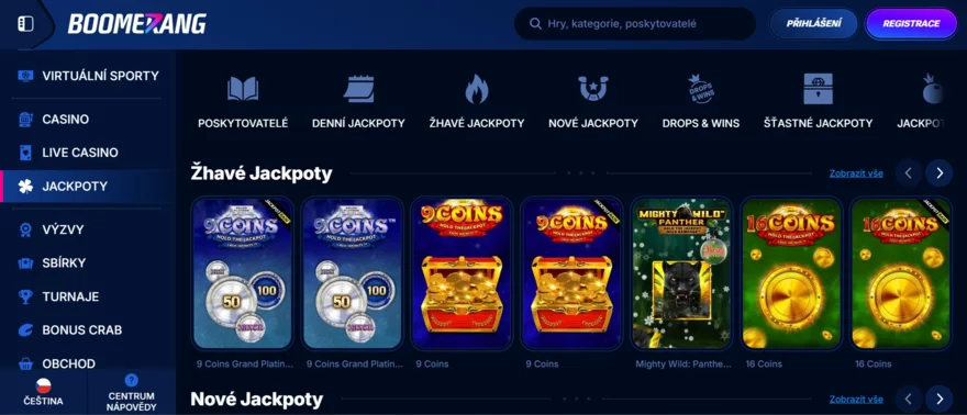 V sekci automatů najdete i záložky jako Jackpoty (jackpot slots), Megaways, Nové hry či Populární, případně sekci Boomerang Originals pro exkluzivní hry (což naznačuje, že provozovatel má i vlastní hry či exkluzivní tituly). Jackpotové hry (např. Mega Moolah, Divine Fortune atd.) jsou dostupné – jen upozorníme, že jackpot sloty nelze hrát s aktivním bonusem (nepřispívají do plnění protočení).
