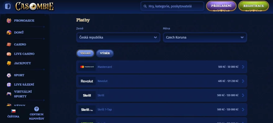 Online casino Casombie podporuje hned několik platebních metod pro vklad financí na hráčský účet. Jsou jimi následující: