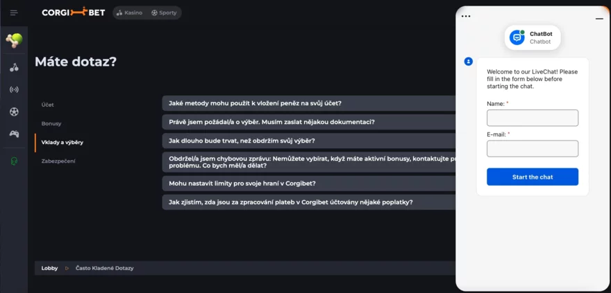 CorgiBet má okamžitě dostupnou 24/7 podporu. Hlavním kanálem je live chat – živě reagující operátoři jsou podle dostupných zkušeností velmi ochotní, přátelští a schopní řešit dotazy přímo na místě. Při našem testování reagovali bezprostředně a poskytovali užitečné odpovědi – hráči tak mají pocit, že mluví s opravdovou osobou, nikoli jen s botem. Alternativou je e-mailová podpora, kde lze své stížnosti či žádosti poslat kdykoliv (běžně na ní dostanete odpověď v řádu hodin až dnů). Tým doručuje asistenci také menším i neregistrovaným uživatelům, zákazníci mohou využít i formulář či telefon, pokud je dostupný. Celkově má podpora multijazyčný profil – kromě angličtiny reaguje i ve francouzštině, španělštině, němčině a portugalštině..