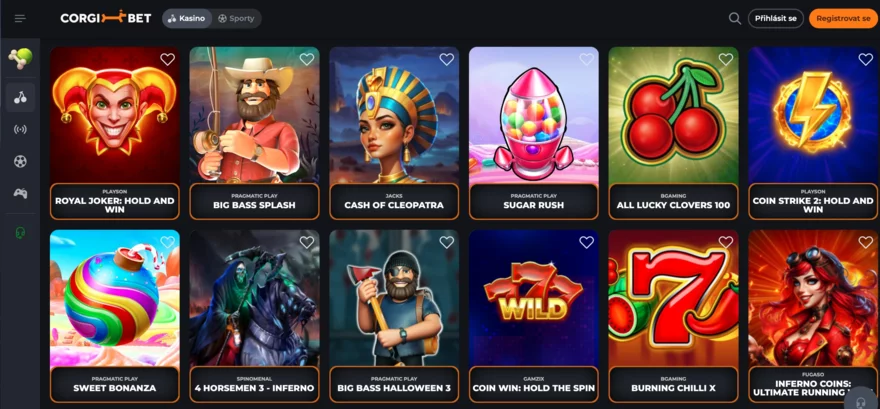 CorgiBet má přehlednou a moderní herní platformu, kde najdete přes 6 000 titulů většinu známých jmen – v knihovně najdeme Pragmatic Play, BGaming, Evolution, NoLimit City, Yggdrasil, Betsoft a desítky dalších. Nabídka zahrnuje klasické výherní automaty (včetně Megaways a progresivních jackpotů) i stolní hry – ruletu, blackjack, poker nebo baccarat. Mezi populární automaty zmíníme například Gates of Olympus, Book of the Fallen či Big Bass Bonanza.