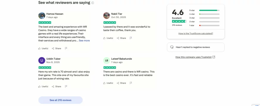 Co se týče online recenzí DudeSpin, casino si zatím vede dobře. Přestože je relativně nové, a nemá tedy zatím tolik recenzí, ty, co se objevují, jsou převážně pozitivní. Na webu Trustpilot má casino DudeSpin hodnocení 4.6/5, což je téměř perfektní.