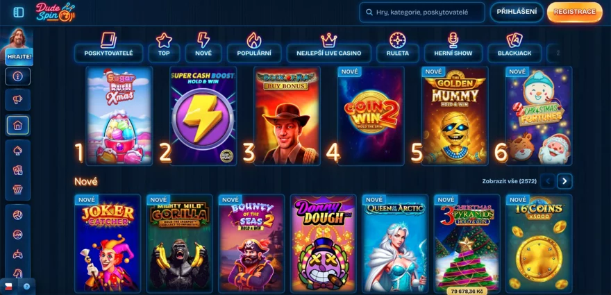 Knihovna DudeSpin Casino čítá tisíce titulů od předních vývojářů. Nalezneme tu především moderní videoautomaty s populárními mechanikami (Megaways, Cluster Pays, kaskádové válce) i klasické ovocné sloty. Fanoušci stolních her ocení desítky variant rulety, blackjacku, baccarat či kostek. Velká část her je dostupná v demo režimu – můžete si je vyzkoušet zdarma, než se rozhodnete investovat. Portfolio doplňují stovky jackpotových her (Mega Moolah, Hall of Gods a další) i momentálně přes 6 000+ dalších titulů, takže hra nuda nehrozí.