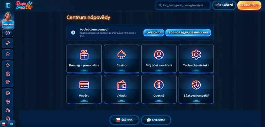 Zákaznický servis DudeSpin casina funguje 24 hodin denně, 7 dní v týdnu. Můžete využít integrovaný live chat (není třeba se nijak registrovat) nebo napsat email (support@dudespin.com) na podporu. Odpověď z chatu bývá podle zkušeností hráčů často blesková – do jedné minuty, což je nadstandard. K dispozici je i obsáhlé Help centrum s často kladenými dotazy, které krok za krokem vysvětluje vše potřebné (registrace, ověření, bonusy, transakce apod.).
