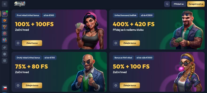 Pro nové hráče si Gangsta Casino připravilo uvítací balíček v celkové hodnotě až 400% do výše 3 300 € a 420 free spinů na prvních pět vkladů. Za první vklad získáte 100% bonus (až 500 €) + 100 otoček zdarma, další vklady přináší další bonusové procenta i free spiny. Welcome bonus se aktivuje automaticky – občas bývá k mání pár volných otoček za registraci.
