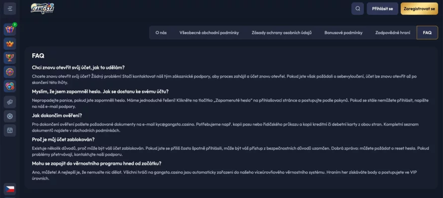 Stránky Gangsta Casina jsou kompletně přeloženy do češtiny, což českým hráčům usnadňuje orientaci a porozumění pravidlům. Herní nabídka, bonusy i podmínky jsou dostupné v českém jazyce. Pouze zákaznická podpora komunikuje převážně anglicky, ale jinak je lokalizace webu na výborné úrovni. Čeští hráči zde mohou využívat všechny funkce casina bez omezení – jediné drobné minus je, že účet je veden v eurech (vklady/výběry v CZK se automaticky přepočítají).
