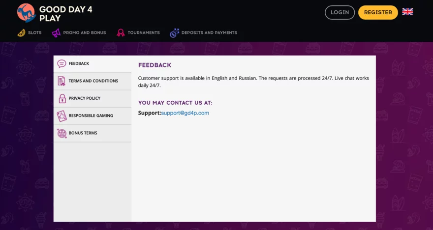 GDFPlay Casino má podporu ve dvou jazycích – angličtině a ruštině. Hráči mohou kontaktovat support tým prostřednictvím sekce "SUPPORT" na stránkách casina, což je velmi jednoduchý a přímý způsob, jak se dostat k pomoci.