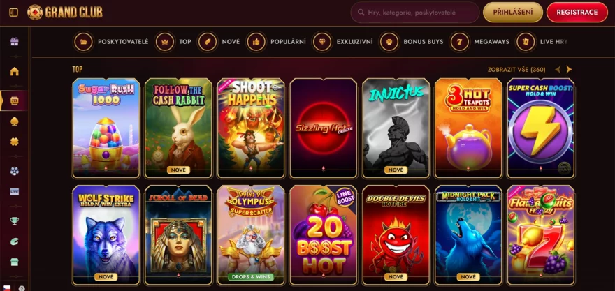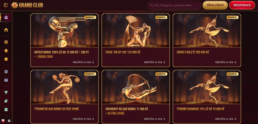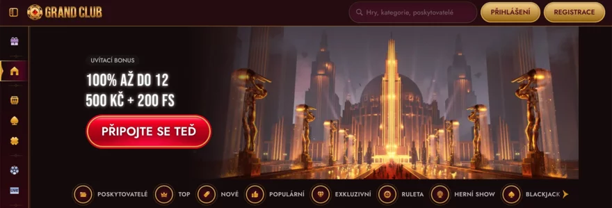 Grand Club Casino je nováčkem na online herní scéně, ale už od svého spuštění v létě 2024 působí dojmem, že přišlo nabídnout zážitek hodný červeného koberce. Hned po vstupu vás přivítá luxusní zlaté prostředí, monumentální vizuály a atmosféra připomínající slavnostní gala večer. Design tu není jen na okrasu – pod pozlaceným kabátem se skrývá obrovská knihovna více než 8 000 her, propracovaná sekce live casina, sportovní sázky a e-sporty i speciální promoakce, které jinde nenajdete. Grand Club navíc spojuje casino a sázkovku pod jednou střechou, takže se mezi jednotlivými formami zábavy přepíná bez zbytečných kliků. V této recenzi se podíváme, zda jeho vítací balíček, turnaje, VIP program i celková uživatelská zkušenost stojí za to – a co mohou očekávat čeští hráči, kteří chtějí okusit zlatý svět online zábavy.
