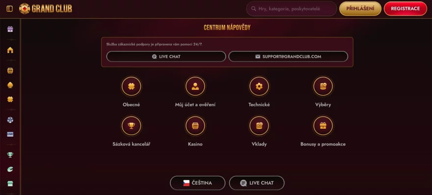Grand Club casino nabízí více kanálů pro kontakt, přičemž nejrychlejší je 24/7 live chat přímo na webu. Stačí kliknout na widget podpory nebo přejít do centra nápovědy (help center) a během půl minuty se spojíte s operátorem. K dispozici je i e-mailová adresa (email) support@grandclub.com, vhodná pro složitější dotazy či zaslání dokumentů. Na webu najdete také FAQ sekci v češtině, která vysvětluje běžné otázky k registraci, bonusům, platbám i výběrům.