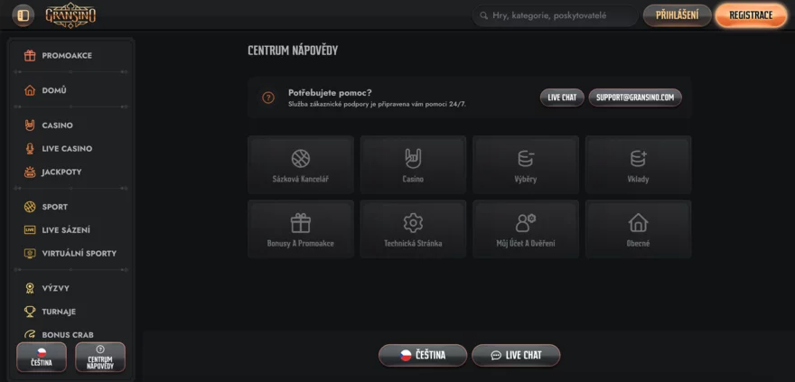 Zákaznická podpora Gransino casina je dostupná 24/7 přes live chat a email (support@gransino.com). Live chat reaguje rychle, a komunikace je dostupná i v češtině, což je pro české hráče velkou výhodou. Emailové odpovědi trvají obvykle do 48 hodin. Na webu je také sekce FAQ s nejčastějšími dotazy, která pokrývá základy, jako jsou bonusy, platby nebo ověření účtu.