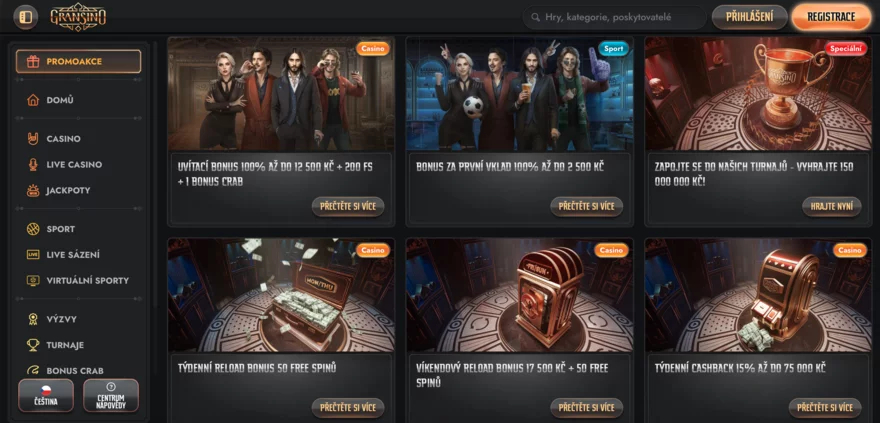 Gransino přichází s velmi štědrým bonusovým programem, který osloví jak nové hráče, tak dlouhodobé příznivce. Uvítací balíček nabízí 100% bonus až do 12 500 Kč k prvnímu vkladu, 200 free spinů na vybrané sloty a dokonce 1 Bonus Crab – exkluzivní herní prvek, který může přinést další výhry. Tento bonus je ideální pro nově registrované hráče, kteří chtějí začít s vyšším rozpočtem. Podmínky pro získání jsou standardní: minimální vklad činí 500 Kč a sázkové požadavky jsou 35x u bonusových peněz a 40x u výher z free spinů.